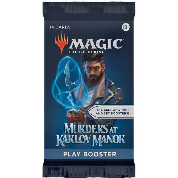 Magic: The Gathering Murders at Karlov Manor Play Booster Pack. Each pack contains 14 cards including a mix of commons, uncommons, rares, and mythic rares. Investigate the mystery at Karlov Manor!